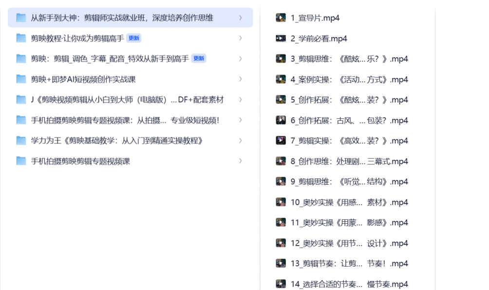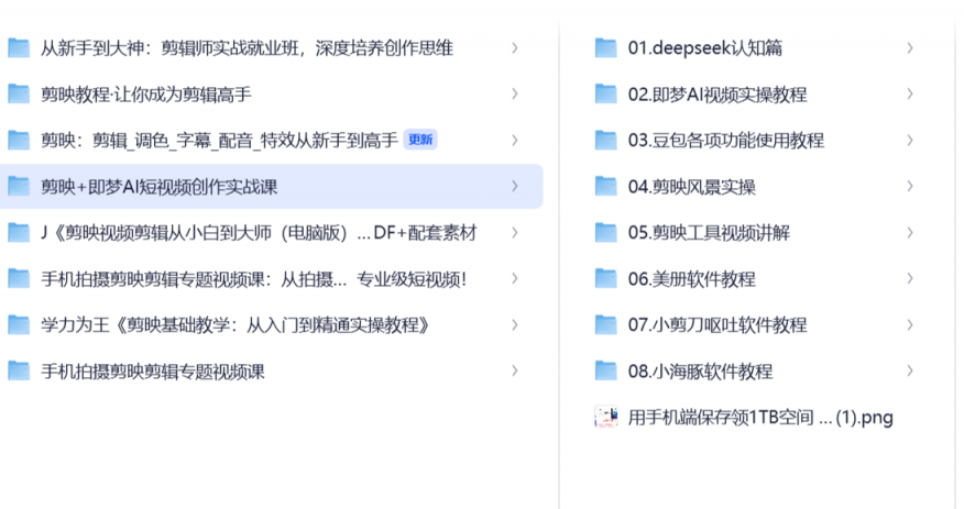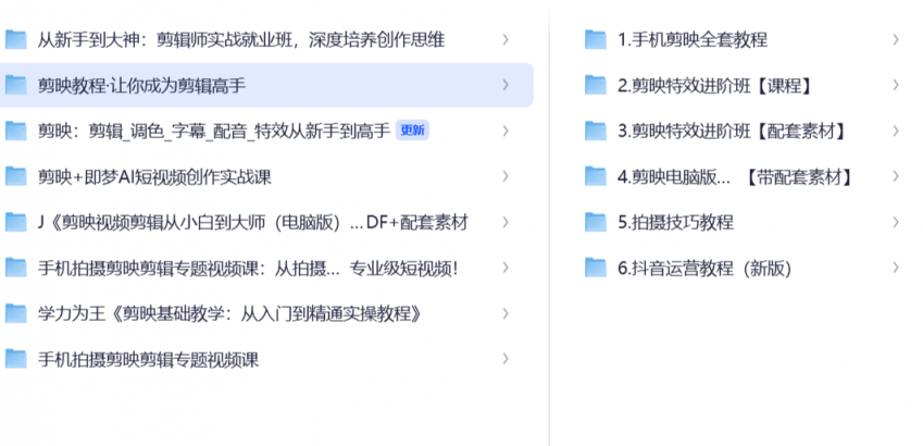 《剪映基础教学》《特效进阶》《手机拍摄技巧》《抖音运营课》《AI剪辑实操》《美册/小海豚/即梦教程》等等!