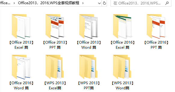按软件与版本细分:教程严格按 Office 2013、Office 2016、WPS 2013 三个系列划分,每个系列下再细分为 Word、Excel、PPT 三大核心组件。